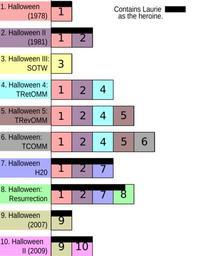 | Keywords: Halloween storyline continuity histogram by film.svg en A Histogram of the Halloween storyline continuity own The LMOE 2010-08-28 Instructions Generated in gnuplot with the following script set term svg set out test svg set title Halloween storyline continuity by film rotate by 90 unset ytics unset key set boxwidth 0 75 absolute set border 3 front linetype -1 linewidth 1 000 set style fill solid 10 00 border -1 set style histogram rowstacked title offset character 0 0 0 set style data histograms set xtics border in scale 0 0 5 nomirror rotate by 90 offset character 0 0 0 set yrange 0 00000 7 noreverse nowriteback plot 'data dat' using 2 using 3 t 2 Halloween II 1981 using 4 t 3 Halloween III Season of the Witch using 5 t 4 Halloween 4 The Return of Michael Myers using 6 t 5 Halloween 5 The Revenge of Michael Myers using 7 t 6 Halloween The Curse of Michael Myers using 8 t 7 Halloween H20 20 Years Later using 9 t 8 Halloween Resurrection using 10 t 9 Halloween 2007 using 11 xtic 1 t 10 Halloween II 2009 and data file data dat 1 2 3 4 5 6 7 8 9 10 1 Halloween \n 1978 1 0 0 0 0 0 0 0 0 0 2 Halloween II\n 1981 1 1 0 0 0 0 0 0 0 0 3 HalloweenIII\n SOTW 0 0 1 0 0 0 0 0 0 0 4 Halloween 4 \nTRetOMM 1 1 0 1 0 0 0 0 0 0 5 Halloween 5 \nTRevOMM 1 1 0 1 1 0 0 0 0 0 6 Halloween \nTCOMM 1 1 0 1 1 1 0 0 0 0 7 Halloween \nH20 1 1 0 0 0 0 1 0 0 0 8 Halloween \nResurrection 1 1 0 0 0 0 1 1 0 0 9 Halloween \n 2007 0 0 0 0 0 0 0 0 1 0 10 Halloween\nII 2009 0 0 0 0 0 0 0 0 1 1 Then a lot of editing in inkscape unfortunately Now rotate the image 90 degrees Halloween franchise |