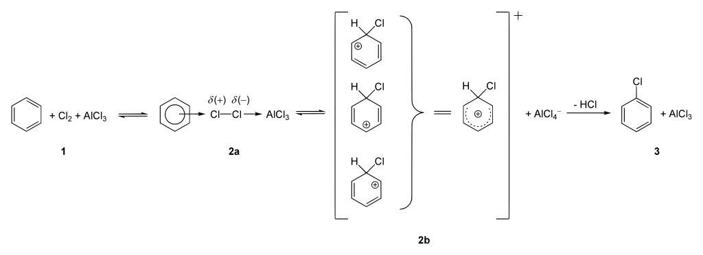 | Keywords: Halogenation of benzene.svg  en Halogenation of benzene 1 with cloride to Chlorobenzene 3 de Halogenierung von Benzol 1 mit Chlor zu Chlorbenzol 3 own Yikrazuul 2008-10-14 Electrophilic aromatic halogenation reactions Aromatics Reactions of benzene |