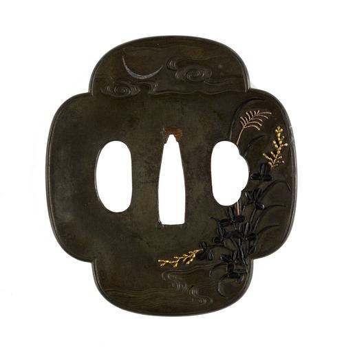 | Keywords: Hamano Harutoshi - Tsuba with Autumn Flowers - Walters 51127.jpg This tsuba shows the moon with seasonal flowers Beneath a full moon on the front are golden lace ominaeshi and bush clover hagi On the back pampas grass susuki and dianthus nadeshiko are depicted beneath a crescent moon Golden lace and bush clover are both indicative of autumn Pampas grass is also a sign of autumn while dianthus is a summer flower With this combination of flowers and a crescent rather than full moon the back of the tsuba seems to be invoking the seasonal change from summer to autumn ca 1850 late Edo silver alloy with silver gold-copper gold and silver-gold cm 7 2 accession number 51 127 39526 Henry Walters Baltimore date and mode of acquisition unknown Walters Art Museum Henry Walters Acquired by Henry Walters Signature Hamano Harutoshi kao place of origin Edo present-day Toyko Japan Walters Art Museum license Tsuba in the Walters Art Museum Hamano Harutoshi Media contributed by the Walters Art Museum needs category review |