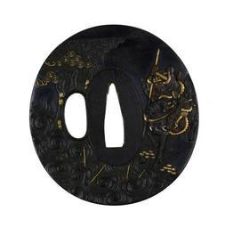 | Keywords: Hamano Naoyuki - Tsuba with a Kuanyu Preparing to Throw a Spear - Walters 51208.jpg The mounted figure along the right edge of this tsuba is 2nd century Chinese general Kanyu Ch Guan Yu Kuan Yu Stories of his activities during the Three Kingdoms period are told in the 14th century novel Romance of the Three Kingdoms Kuanyu is about to plunge his spear into the water Waves fill the lower section of both sides of the tsuba On the reverse the spears and battle flag of a army appear above the waves between 1773 1829 late Edo shakudo details in gold cm 7 2 6 7 0 35 accession number 51 208 11048 Henry Walters Baltimore date and mode of acquisition unknown Walters Art Museum Henry Walters Acquired by Henry Walters Signature Hamano Naoyuki place of origin Edo present-day Tokyo Japan Walters Art Museum license Tsuba in the Walters Art Museum Hamano Naoyuki Media contributed by the Walters Art Museum needs category review Guan Yu |