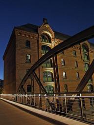 Keywords: hamburg bridge speicherstadt building homes architecture night photograph abendstimmung