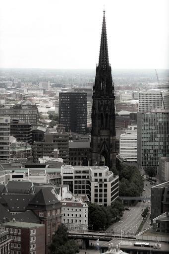 Keywords: hamburg church steeple color key elbe port city architecture building
