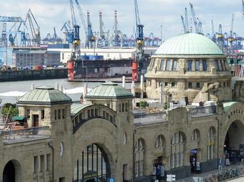 Keywords: hamburg hanseatic city germany architecture building landmark historically tourist attraction landungsbrücken port crane harbour cranes industrial crane
