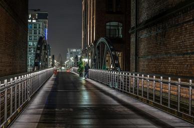 Keywords: hamburg night speicherstadt harbour city bridges light substantiate wood old new human talk