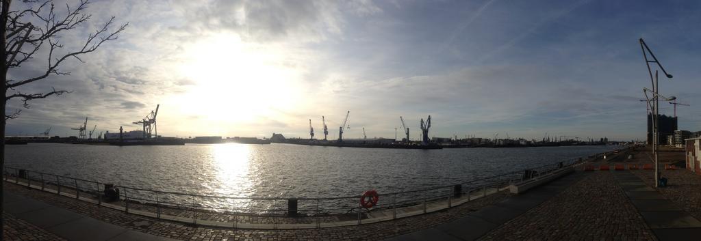 Keywords: hamburg port winter germany elbe ship landungsbrücken harbour cranes sea dyke road northern germany port city cranes panorama sun promenade harbour city water bank urban