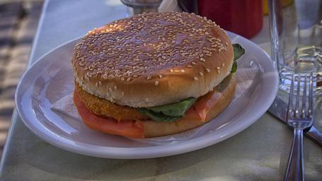 Keywords: hamburger food bread breakfast restaurant restaurant table