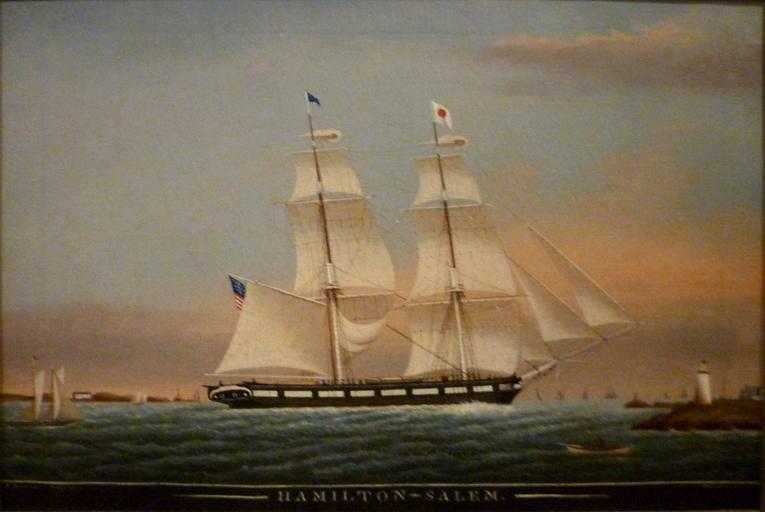 | Keywords: Hamilton, Salem.jpg Hamilton Salem Portrait of the ship Hamilton Oil on canvas Salem Massachusetts USA The Hamilton was built in 1830 and carried cargo between New England and West Africa It is shown passing by Marblehead Massachusetts Visible in the painting are Cat Island on the left and Marblehead Light on the right I took this photo of artwork at the Peabody Essex Museum 1851 Attributed to William Henry Luscomb 1805-1866 PD-old-100 Oil paintings in Peabody Essex 19th-century sailing ships in paintings Template artwork possible |