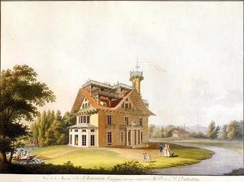 | Keywords: Hammer CG (C16)Sommerhaus.jpg Bild-Beschreibung / description of picture 10 top right style background 87CEFF Titel / Title Sommerhaus des Fürsten Putjatin - valign top right style background 87CEFF Beschreibung / Description Blick auf das Sommerhaus; Land Werk und Eigentum der Fürstin und des Fürsten Putjatin <br/> Nachdem Nikolai Abramowitsch Fürst Putjatin wegen seiner Liebesaffäre mit der verheirateten Gräfin Elisabeth von Sievers den Hof der Zarin Katharina II in Petersburg verlassen musste erwarb er am 21 Dezember 1797 das damalige Petzold ™sche Bauerngut in der südöstlich von Dresden gelegenen Kleinzschachwitzer Dorfflur die seinerzeit unter der Gerichtsbarkeit des Rittergutes Lodwitz stand und siedelte sich dort mit seiner Gräfin und deren zweiter Tochter Elisabeth Benedicta die an einer Lungenkrankheit litt an <br/> Der Fürst entwarf und baute auf dem erworbenen Gelände dem noch einige Wald- und Feldstücke zugefügt wurden seine žKate wie er das Sommerhaus zu nennen pflegte das vollkommen auf die Genesung der Stieftochter ausgerichtet war In alle Richtungen der Windrose waren Balkone angebracht sechszehn Stück insgesamt weiträumige Dachterrassen und ein Turm zur Wetterbeobachtung in der Form eines Minaretts waren weithin sichtbare Elemente des von einem mehrfach überbrückten Bach umflossenen Hauses Innerhalb der Villa gab es einen runden Speisesaal mit einem eisernen Ofen in Form einer Palme sowie zwei Salons von denen der größere von einer gläsernen Orangerie mit Springbrunnen umschlossen wurde Die Wohnräume in den oberen Etagen durch liftartige Maschinen erreichbar waren sehr bequem der Raum der Tochter grenzte unmittelbar an einen Kuhstall weil man meinte dass die Stalldüfte für die Heilung der Lunge dienlich seien Im Garten gab es zunächst einen labyrinthischen durch Seitenfenster erhellten und mit Rasen ausgekleideten Gang für angenehm kühle Spaziergänge weiterhin viele künstliche Ruinen Tempel und Grotten schattige Sitzgelegenheiten Vexierspiegel und Wasserspiele außerdem Schöpfräder am Bach zur Bewässerung der vielen Rasen- und Pflanzenrabatten sowie als besonderes Hobby des Fürsten eine für 30 Personen ausgelegte Schaukel Für sich selbst hatte er sogar eine Art Seilbahn konstruiert mit der er in rasender Fahrt von einem Seitenfenster der oberen Etage zum Fuße eines Baumes inmitten des Gartens gelangen konnte Der Park war für das allgemeine Publikum geöffnet und seinerzeit weithin bekannt weshalb der Hammersche Kupferstich auch in ein vom Dresdener Kunsthändler Heinrich Rittner herausgegebenes Magazin aufgenommen wurde <br/> Heute existiert noch ein http //www putjatinhaus de Putjatinhaus in Dresden-Kleinzschachwitz <br/> alt-aquarellierter Umrissstich<br/><br/> View of the summer house; Country work and property of the princess and the prince Putjatin <br/> After Nikolai Abramowitsch prince Putjatin had to leave the yard of the Katharina II in Petersburg because of its affair with married countess Elizabeth von Sievers he acquired at the 21 Dezember 1797 the Petzold-Farm in the village Kleinzschachwitz lain southeast from Dresden which stood at that time under the jurisdiction of the manor Lodwitz He settled themselves there with its countess and their second daughter Elizabeth Benedicta which suffered from a lung illness <br/> The prince designed and built on the acquired area to which still some forest and pieces of field were added his žCottage as he tended to call the summer house which was to set perfectly for the healing of the stepdaughter Into all directions of the compass rose balconies were attached sixteen pieces altogether spacious roof terraces and a tower for to watch the Weather situation in the form of a Minarett were far away visible elements of the house flowed around by a several times bridged brook Within the mansion there was a round dining room with an iron furnace in form of one palm as well as two salons by which the larger of a glassy orangeriy was enclosed with jumping wells The dwellings in the upper floors by elevator-like machines attainable were very comfortable the area of the daughter bordered directly on a cow stable because one meant that the stable smells for the healing of the lung were helpful In the garden there was first a labyrinth-like corridor by side windows illuminated and with lawns lined course for pleasantly cool walks further many artificial ruins temples and grottos shady seat opportunities mirrors of distortion and watergames in addition persian weels at the brook to the irrigation of the many racing and plant discounts as well as special hobby of the prince a swing laid out for 30 persons For itself it had designed even a kind aerial ropeway with which it could arrive in racing travel of a side window of the upper floor at the foot of a tree in the middle of the garden The park was for the general public opened and at that time far away well-known why the etching by Hammer was taken up also to a magazine published by the dealer of art Heinrich Rittner from Dresden <br/> outline etching in old original color top right style background 87CEFF Autor / Artist gezeichnet und gestochen / painting and etching Christian Gottlob Hammer 1779-1864 top right style background 87CEFF Quelle / Source http //www saxonia com Galerie SAXONIA München; Objekt-Nr 006176 top right style background 87CEFF Datum / Date 1811 top right style background 87CEFF Lizenz / License PD-old Houses in Dresden Nikolai Abramowitsch Putjatin Cultural heritage monuments in Dresden-Kleinzschachwitz Christian Gottlob Hammer 1811 in Dresden Images from Galerie Saxonia |