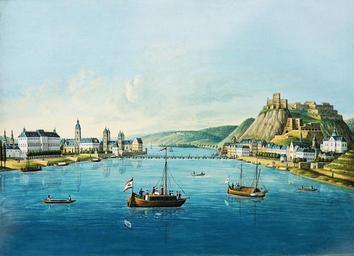 | Keywords: Hammer CG (E01)Koblenz.jpg Von einem fiktiven Standpunkt aus erhöht und in der Mitte des Rheins geht der Blick links zum Ufer der Stadt Koblenz beginnend mit den Zwillingstürmen der Liebfrauenkirche über Kurfürstliches Schloss und Basilika St Kastor bis hin zum Deutschherrenhaus Als Gegengewicht dazu auf der rechten Seite der Ort Ehrenbreitstein mit der darüber liegenden gleichnamigen Festung die zur Zeit der Entstehung des Bildes gerade neu erbaut und fertiggestellt wurde Beide Orte sind verbunden durch die 1819 gebaute und heute nicht mehr vorhandene Schiffsbrücke welche das Bild horizontal gliedert Im Hintergrund die Rheininsel Niederwerth vor den dahinterliegenden Höhenzügen des Westerwaldes Oberhalb der Insel ist das Klostergut Besselich zu sehen <br>Das Bild gehört zu einer Serie von Rheinansichten um 1829 From a fictitious point of view heightened and in the middle of the river Rhine the view goes to the left bank of the city Koblenz beginning with the twin towers of the church Liebfrauenkirche over the castle Kurfürstliches Schloss and the Basilika Saint Castor up to the German-manor-house from the German Order As counterweight to it on the right side the town Ehrenbreitstein with the fortress Ehrenbreitstein Both points are connected by the 1819 built and today no longer existing ship bridge which the picture in the horizontal structured In the background the Rhine-Island Niederwerth in front of the hills of the Westerwald Above the island the formerly monastery Besselich <br>The picture belongs to a series of Rhine-Views around 1829 ~ 1829 Gouache 36 5 x 49 cm Mittelrhein-Museum Koblenz object history credit line accession number Inv -Nr M 1985/19 http //www mittelrhein-museum de Mittelrhein-Museum Koblenz; Inv -Nr M 1985/19; Ektachrome Nr 3967; Foto Foto-Gauls Koblenz PD-old-100 Christian Gottlob Hammer Floating bridge in Koblenz Gouache paintings Rhine in Koblenz Barges of Germany Historic views of Koblenz Koblenz in the 19th century Historical images of the Festung Ehrenbreitstein Photographs taken on Ektachrome and Elite Chrome film |