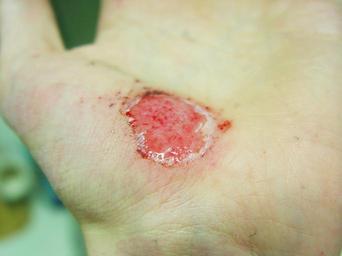 Keywords: Hand Abrasion - 16 hours 45 minutes after injury.JPG en Abrasion caused by sliding fall on concrete own Jpbarrass 2008-11-08 Abrasion medical Wound healing