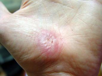 Keywords: Hand Abrasion - 21 days 18 hours 21 minutes after injury.JPG en Abrasion caused by sliding fall on concrete own Jpbarrass 2008-11-29 Abrasion medical Wound healing
