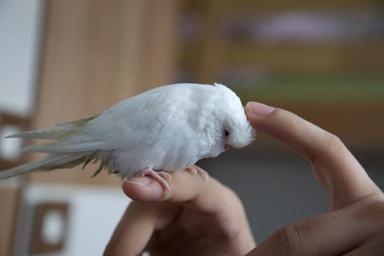 Keywords: hand stroking parrot pet bird white budgie