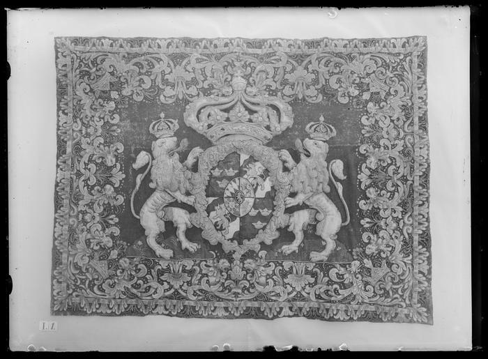 | Keywords: Handhästtäcke ur en svit om tolv med svenska riksvapnet. Tillhört Karl XI, beställda i Frankrike - Livrustkammaren - 9199.tif Rektangulärt täcke av blått kläde med applikationsbroderier av kläde i flera färger huvudsakligen gult och vitt samma typ som nr 4046 Ihopsytt av två tvärgående våder denövre har en bredd av 701 mm den nedre 1070 mm <br/><br/>Vapenbroderi b 1550 mm h 950 mm i hög relief högsta punkt ca 40 mm täckets bottentygunderlag för applikationer i yllekypert och schattersöm Kartusch av gul yllekypert medsnoddar läggsöm och schattersöm i gulbrunt med bruna konturer Kvadreradsköld fält 1 och4 tre kronor fält 2 och 3 folkungalejonet Hjärtsköld Bayern rutor av vitt och blått Juelich svart lejon på gult fält Cleve rött fält därpå vit sköld och därifrån utgåendegula liljestänglar Berg gult lejon på vitt fält mittsköld Pfalz gult lejon på svartfält Kartuschen krönt av kunglig krona med bottentyg av gul yllekypert på kronringen gråklumpsöm kantad med snoddar fem bladornament fyra synliga byglar kantade med snoddar riksäpple av gul och vit yllekypert Sköldhållare två krönta lejon med botten av gulyllekypert krönta med kronor av samma utförande som den stora kronan <br/><br/>Lejonens manar i schattersöm tungor av röd yllekypert med gles schattersöm i gult ochbrunt ullgarn kantade med brunt ullgarn fastsytt med läggsöm Tänderna saknas Svansar av10 mm tjock gulbrun snodd Lejonen står på var sitt applicerat postament av blå yllekypert enkelt broderat med gula blommor och gröna blad <br/><br/>Bård b 420 mm Längs kanterna är mönstret spegelvänt med omväxlande palmettmotiv ochöppna kronor i hörnen Varje sidas mittpalmett och kronorna omges av två gapandelejonhuvuden Palmetterna i applikationer av yllekypert i vitt gult och svart kantade medhöger- och vänstervridna snoddar i gult och svart ylle fastsydda med läggsöm Påapplikationerna sitter snoddar och schatteringar i gult brunt beige och grått ullgarn Ibårdens nedre del ett band i vit yllekypert med dekor i klumpsöm av gult ullgarn Över ochunder bandet slingrar liljeblad och blommor Kronorna och lejonhuvudena i relief h 10-15mm Gula prickar i plattsöm spridda mellan applikationerna <br/><br/>Foder av gråbrun jute gles tuskaft På fodret ett 60 mm brett kraftigt bomullsband och niolädertampar med mässingsringar längs överkanten original caption - 1671 1683 broadcloth Färg blå gul vit material kläde size mm 2400 1770 LRK Karl XI av Sverige place of origin original filename LN_B03521_006401 40686 inventory number LRK 4091 9199 CC0 Handhästtäcke ur en svit om tolv med svenska riksvapnet Tillhört Karl XI beställda i Frankrike - Livrustkammaren - 9199-negative tif <gallery caption Different images of same object > File Handhästtäcke sv riksvapen - Livrustkammaren - 17241 tif </gallery> Horse equipment Media contributed by LSH unmatched material Media contributed by LSH unmatched creator Horse tack images from Livrustkammaren Media contributed by LSH 2013-10 |