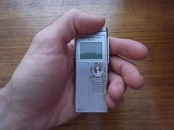 Keywords: HandHeldRecorder.JPG en a hand held digital voice recorder own justin evans 2011-06-21 Cc-zero Justin Evans' small studio for game sound Digital dictation machines