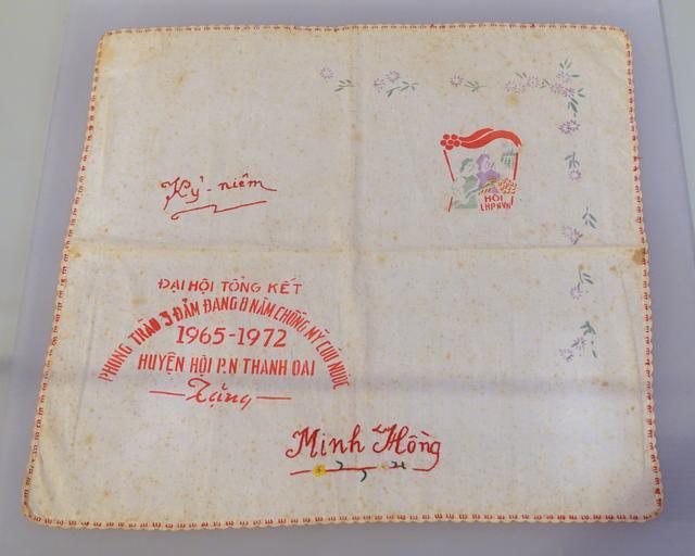 | Keywords: Handkerchief given to Hoang Thi Hong at the conference for the evaluation of the Three Responsibilities movement, Ha Tay, 1972 - Vietnamese Women's Museum - Hanoi, Vietnam - DSC04218.JPG en Exhibit in the Vietnamese Women's Museum Hanoi Vietnam Photography was permitted in the museum without restriction 2014-08-04 04 00 58 own Daderot other versions cc-zero Wartime items in the Vietnamese Women's Museum Uploaded with UploadWizard Handkerchiefs | ||||