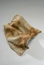 | Keywords: Handkläde, hjärteduk, Gustav II Adolf - Livrustkammaren - 75722.tif Kvadratisk duk av linnelärft med ett trådantal av 37 x 37 per cm2 Duken har stadkant på 2 sidor och är fållad på de två övriga I ena hörnet är en ägarebeteckning h 16 mm broderad med svart silke i ojämna efterstygn osäker tolkning krönt G eller vapensköld med bjälke Duken vikt med tre längsgående veck och är fläckad av ringformiga rostfärgade fläckar i fyra grupper om två varav två av grupperna är svagare Dessutom är hela ena sidan med märkningen fläckad likaså fläckad Enligt uppgift se litt kan fläckarna vara från konungens balsamerade hjärta som efter balsameringen i Weissenfels kyrka begravdes under predikstolen Duken kan i så fall ha förenats med övriga Lützenminnen av drottningen sedan hon mottagit hjärtat för förvaring Fläckarna är enl uppgift inte blod utan troligen balsameringsmedel Ägarmärkningen i hörnet skulle kunna vara hovmarskalken Bernolf von Craylsheims vapen en sköld med bjälke Linen cloth square with a thread count of 37 x 37 per square cm The linen has selvages on two sides and is hemmed at the other two In one corner is an owner name 16 mm high embroidered with black silk in uneven backstitch of uncertain interpretation perhaps a crowned G or a crest with a beam The canvas is folded in three lengthwise and is stained by annular rust colored spots in four groups of two; two of the groups are weaker Moreover the whole of one side with the label stained is similarly Reportedly see literature the spots may be from the king's embalmed heart which was buried under the pulpit of Weissenfels church after embalming The cloth would then have been united with the rest of the Lutzen Memorials of the Queen since she received the heart for safekeeping The spots are not blood but probably embalming fluid The ownership label in the corner might be Lord Chamberlain Bernolf von Craylsheim's arms which consists of a shield with beam original caption Handkläde hjärteduk Gustav II Adolf LRK 31143<br/> Nyckelord Maria Eleonora Textilier Föremålsbild Gustav II Adolfs Död Slaget vid Lützen 1632 g 93 size mm 930 960 LRK Maria Eleonora av Sverige drottning 1599- Königsberg Maria Eleanora of Sweden Gustav II Adolf Minnesutställning 1932 1932 Drottningar - kvinnlighet och makt 1999 Jubileumsutst Lützen-Kapelle 2007 2007 Bilder av Kristina 2013-2014 Livrustkammaren Basutställning place of origin original filename lm_dig2568 67775 inventory number LRK 31143 75722 CC-BY-SA Göran Schmidt <gallery caption Different images of same object > File Handkläde - Livrustkammaren - 77219 tif File Handkläde - Livrustkammaren - 68660 tif File Handkläde - Livrustkammaren - 77188 tif File Handkläde - Livrustkammaren - 68629 tif File Handkläde - Livrustkammaren - 144 tif </gallery> Göran Schmidt Textiles Gustav II Adolf of Sweden Handkerchiefs Clothes of Gustav II Adolf Media contributed by LSH unmatched material Media contributed by LSH unmatched objKeyword Media contributed by LSH unmatched keyword Color images from Livrustkammaren Media contributed by LSH 2013-10 |