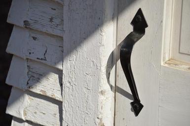Keywords: handle steal blacksmith door open closed weathered wall door knob light shadow black white outside steel