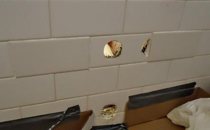 | Keywords: Handyman photos Fix Barber Wilson diverter valve 13.JPG en Old tiles have been removed and new ones added since the new Price Pfister valve system has a different width than the defective Barber Wilsons stems The two new tiles are almost a perfect match -- new holes will be drilled for the stems Background This is image 13 of a repair project to fix a shower/tub diverter valve made by Barber Wilsons Co Ltd The handle which was supposed to divert water to the shower but it did not work; a plastic piece inside was broken Unfortunately since this valve could not be fixed from the front it required a major operation to open up the back and replace pipes I ended up replacing the defective valve with a Price Pfister valve-set so in future repairs will be easy 2015-09-18 own Tomwsulcer other versions cc-zero Uploaded with UploadWizard Tiling Plumbing Handyman photos by tom sulcer |
