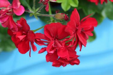 Keywords: hanging geranium red blue geranium flower summer hanging plant green outdoors blossom colorful exterior home blooming color nature floral