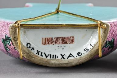 | Keywords: Hängvas undersidan - Hallwylska museet - 99431.tif LSH artwork sv HÄNGVAS ett par Framsidan bukig baksidan plan på densamma en krokholk Runt halsen i relief ett dubbelt band framtill med knut halsen och skuldran veckiga På buken i mitten en rund medaljong med skrivtecknet för ordet shou långt liv ; på ömse sidor en drake omgiven av blom- och bladrankor På foten en snirkelbård nedanför mynningen en meanderbård På mynningskanten samt på fotens ytterkant en guldrand Baksidan vasen inuti delvis samt krokholken inuti är turkosfärgade <br/>Pair of porcelain wall vases decorated in overglaze enamels<br/>Mark and period of Qianlong 1736-95 <br/>The vases are in the shape of bags with cords round their necks The backs of the vases are flat with a hole for suspension when used in a room or travelling in a sedan chair The inside neck and back are enamelled turquoise The front has a background pattern of dense dark pink scrolls on a lighter pink ground with a pair of five-clawed dragons confronting a central medallion containing the character for long life Behind and beneath the dragons is a stylised lotus scroll its central flower with upward-pointing stamen Although not of the very first quality the enamelling is done with care and precision The style and content of decoration indicate porcelain produced during the early Qianlong reign in the 1740s The very finest wares of this type in the imperial collections in Taipei and Beijing have underglaze blue marks while these vases have a reign mark in overglaze red enamel original caption Hängvas undersidan <br/> Nyckelord Kinesiska tecken - 1735 1795 size cm 6 9 mynning size cm 4 5 size cm 3 6 mynning size cm 3 5 fot size cm 13 size cm 12 4 size cm 7 8 fot HWY place of origin CN original filename hm_dig13736 14642 inventory number HWY XLVIII X A e s 01 99431 CC-BY-SA Jens Mohr <gallery caption Different images of same object > File Kinesisk signatur och museets föremålsnummer över - Hallwylska museet - 95864 tif File Hängvaser bakifrån tillverkad i Kina 1735-1795 - Hallwylska museet - 99429 tif File Kinesiska porslinshängvaser i rosa från 735-1795 med kinesiska tecknet shou långt liv - Hallwylska museet - 95863 tif File Hängvas undersidan 1700-tal - Hallwylska museet - 99432 tif File Hängvaser från Kina 1735-1795 - Hallwylska museet - 100472 tif File Baksida hängvaser från Kina 1735-1795 - Hallwylska museet - 100473 tif </gallery> Chinese characters Chinese ceramics in the Hallwyl Museum Sweden Ceramics of Korea Ceramics of Japan Urns Ceramics Jens Mohr Media contributed by LSH dim-with multiple size templates Media contributed by LSH 2015-11 |