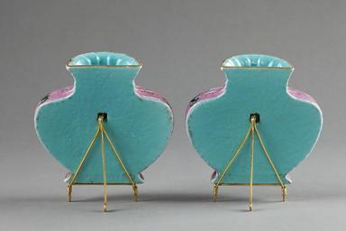 Keywords: Hängvaser bakifrån tillverkad i Kina, 1735-1795 - Hallwylska museet - 99429.tif LSH artwork sv HÄNGVAS ett par Framsidan bukig baksidan plan på densamma en krokholk Runt halsen i relief ett dubbelt band framtill med knut halsen och skuldran veckiga På buken i mitten en rund medaljong med skrivtecknet för ordet shou långt liv ; på ömse sidor en drake omgiven av blom- och bladrankor På foten en snirkelbård nedanför mynningen en meanderbård På mynningskanten samt på fotens ytterkant en guldrand Baksidan vasen inuti delvis samt krokholken inuti är turkosfärgade <br/>Pair of porcelain wall vases decorated in overglaze enamels<br/>Mark and period of Qianlong 1736-95 <br/>The vases are in the shape of bags with cords round their necks The backs of the vases are flat with a hole for suspension when used in a room or travelling in a sedan chair The inside neck and back are enamelled turquoise The front has a background pattern of dense dark pink scrolls on a lighter pink ground with a pair of five-clawed dragons confronting a central medallion containing the character for long life Behind and beneath the dragons is a stylised lotus scroll its central flower with upward-pointing stamen Although not of the very first quality the enamelling is done with care and precision The style and content of decoration indicate porcelain produced during the early Qianlong reign in the 1740s The very finest wares of this type in the imperial collections in Taipei and Beijing have underglaze blue marks while these vases have a reign mark in overglaze red enamel original caption Hängvaser bakifrån tillverkad i Kina 1735-1795 <br/> Nyckelord Föremålsbild Vaser Kinesiskt porslin - 1735 1795 size cm 6 9 mynning size cm 4 5 size cm 3 6 mynning size cm 3 5 fot size cm 13 size cm 12 4 size cm 7 8 fot HWY place of origin CN original filename hm_dig13735 14642 inventory number HWY XLVIII X A e s 01 99429 CC-BY-SA Jens Mohr <gallery caption Different images of same object > File Kinesisk signatur och museets föremålsnummer över - Hallwylska museet - 95864 tif File Hängvas undersidan - Hallwylska museet - 99431 tif File Kinesiska porslinshängvaser i rosa från 735-1795 med kinesiska tecknet shou långt liv - Hallwylska museet - 95863 tif File Hängvas undersidan 1700-tal - Hallwylska museet - 99432 tif File Hängvaser från Kina 1735-1795 - Hallwylska museet - 100472 tif File Baksida hängvaser från Kina 1735-1795 - Hallwylska museet - 100473 tif </gallery> Porcelain of China Vases Chinese ceramics in the Hallwyl Museum Sweden Ceramics of Korea Ceramics of Japan Urns Ceramics Jens Mohr Media contributed by LSH dim-with multiple size templates Media contributed by LSH 2015-11