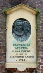 Keywords: Hans Egede Nikolaj kirke.JPG Hans Egede og hustru Giertrud Rasch mindeplade på Nikolaj Kirke København August Hassel own 2010-08 Orf3us Hans Egede Kunsthallen Nikolaj