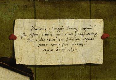 | Keywords: Hans Holbein der Jüngere - Der Kaufmann Georg Gisze (Detail).jpg LargeImage en Detail of Portrait of the Merchant Georg Gisze <br/>The latin poem with Greek title <poem>Διςνχων i Imagine Georgii Gysenii Ista refert vultus qua cernis Imago Georgi Sic oculos viuos sic habet ille genas Anno aetatis suae xxxiiij Anno dom 1532</poem> means <poem>Distichon on George Gisze's picture That what you see is George's picture showing his features how vivid his eyes are and how his cheek is formed In his 34th year of age A D 1532</poem> Hans_Holbein_der_Jüngere_-_Der_Kaufmann_Georg_Gisze_-_Google_Art_Project jpg 50 2012-12-13 09 13 UTC Hans_Holbein_der_Jüngere_-_Der_Kaufmann_Georg_Gisze_-_Google_Art_Project jpg Dcoetzee derivative work Hic et nunc cropped Hic et nunc Hans_Holbein_der_Jüngere_-_Der_Kaufmann_Georg_Gisze_-_Google_Art_Project jpg PD-old-100 Original upload log This image is a derivative work of the following images File Hans_Holbein_der_Jüngere_-_Der_Kaufmann_Georg_Gisze_-_Google_Art_Project jpg licensed with PD-Art 2012-11-05T09 21 43Z Dcoetzee 26292x30000 256239793 Bytes <nowiki>User created page with UploadWizard</nowiki> 2011-02-12T10 32 45Z Dcoetzee 22053x25163 84803113 Bytes <nowiki> LargeImage Artwork Creator Hans Holbein d J Der Kaufmann Georg Gisze Der Kaufmann Georg Gisze date </nowiki> Uploaded with derivativeFX Details of Der Kaufmann Georg Gisze Holbein der Jüngere Details of portrait paintings 1532 Portrait paintings with notes |