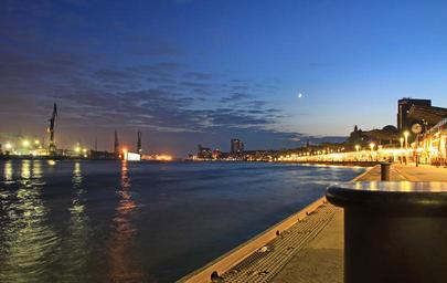 Keywords: harbour city hamburg port germany elbe water urban port city night cranes abendstimmung bank promenade rest silent port of hamburg