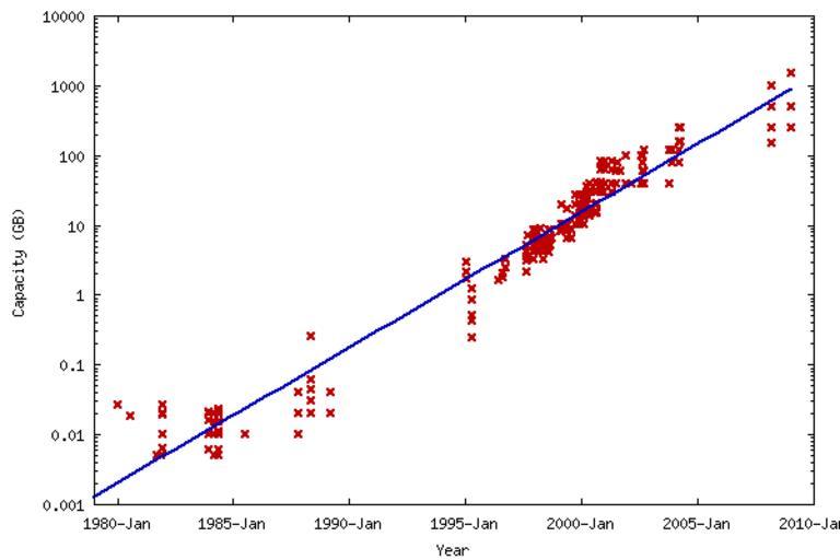 Keywords: Hard drive capacity over time.png Based on en Image KrydersLaw png WARNING This graph is highly misleading since it is based upon advertised retail products and at least in the 1980s misses the higher capacity drives which generally were not offered at retail For example the highest capacity disk drive listed and plotted for 1981 is 26MB while the actual highest capacity HDD then offered was the IBM 3380 at 2 520 MB per disk drive 2 HDAs per disk drive box By the late 90s high performance drives were readily available at retail Tom94022 <span class signature-talk >talk</span> 06 10 25 March 2009 UTC Current version including 2008 data Script and data to generate the plot below I donate this version including the 2008 data to the public domain Hankwang 17 00 2 March 2008 UTC Hard drive capacity over time svg <blockquote> Personal Computer hard disk drive capacity in gigabytes over time Data culled from http //www littletechshoppe com/ns1625/winchest html This is very much a first cut -- an improved image with more data extending further back in time would be much better than this The spreadsheet I used is available; leave me a message on my talk page </blockquote> User Omegatron/GIMP User Omegatron/License Computer science History of computing Hard disks Chronograms |