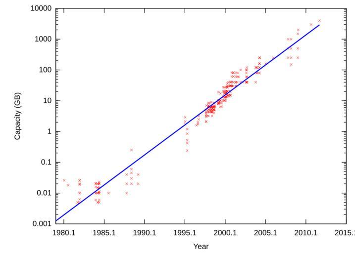Keywords: Hard drive capacity over time.svg Claims to be based on File Hard drive capacity over time png with no indication issues with that version addressed therefore repeated here WARNING This graph is highly misleading since it is based upon advertised retail products and at least in the 1980s misses the higher capacity drives which generally were not <strike>offered</strike> advertised with published retail prices For example the highest capacity disk drive listed and plotted for 1981 is 26MB while the actual highest capacity HDD then offered was the IBM 3380 at 2 520 MB per disk drive 2 HDAs per disk drive box By the late 90s high performance drives were readily available at retail Tom94022 <span class signature-talk >talk</span> 06 10 25 March 2009 UTC Hard disk capacity between 1980 and present 2011 based on for-retail products For data data source and discussion see Talk page on Commons Hankwang 17 00 2 March 2008 UTC update 20 38 18 September 2011 UTC Hard_drive_capacity_over_time png 2009-02-25 16 11 UTC Hard_drive_capacity_over_time png Hankwang derivative work Rentar <span class signature-talk >talk</span> Rentar Hard_drive_capacity_over_time png translation possible Computer science Hard disks History of computing