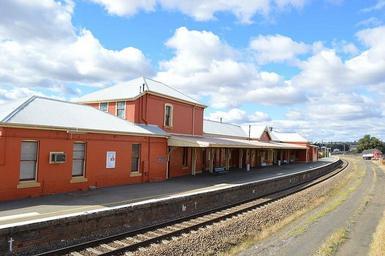 Keywords: 34 33S 148 22E Harden railway station is located on the Main South line in New South Wales, Australia. It serves the town of Harden. Opened 12 March 1877. attribution: Mattinbgn