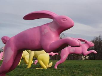 Keywords: hare jump bunny jump running away bounce away pink artwork seat and flitz rabbits rosalie madaris ostfildern esslingen scharnhauser park giant rabbits colorful art modern art art object object art