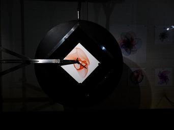 Keywords: harmonograph art artwork red lines aesthetics mechanical device device mechanically overlay harmonious vibration graphic frequency closed curve curve graph lissajous figure phase shift vibration units ellipses