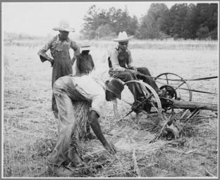 | Keywords: Harmony Community, Putnam County, Georgia.... Binders are not uncommon on large farms, but those who . . . - NARA - 521328.tif Scope and content Full caption reads as follows Harmony Community Putnam County Georgia Binders are not uncommon on large farms but those who can handle all their small grains by hand continue to do so These African-American tenants have made a sort of mechanical cradle out of an old mowing machine with a piece of corrugated iron rigged behind the cutter bar to catch the fallen stalks One man walks along side with a stick and sweeps the standing grain back over the cutter while two others pick it out of the tin cradle and bind it General notes 521328 Local identifier 83-G-41015 Department of Agriculture Bureau of Agricultural Economics Division of Economic Information ca 1922 - ca 1953 NARA-Author Rusinow Irving Photographer 5307166 <br /> Still Picture Records Section Special Media Archives Services Division NWCS-S National Archives at College Park 8601 Adelphi Road College Park MD 20740-6001 1941 05 28 - 1941 06 01 Record group Record Group 83 Records of the Bureau of Agricultural Economics 1876 - 1959 Record group ARC 412 Photographic Prints Documenting Programs and Activities of the Bureau of Agricultural Economics and Predecessor Agencies compiled ca 1922 - ca 1947 documenting the period ca 1911 - ca 1947 Series ARC 521048 File unit File unit ARC Variant control numbers NAIL Control Number NWDNS-83-G-41015 yes Other versions <gallery> File Harmony_Community _Putnam_County _Georgia _Binders_are_not_uncommon_on_large_farms _but_those_who_ _ _ _-_NARA_-_521328 tif tif File Harmony_Community _Putnam_County _Georgia _Binders_are_not_uncommon_on_large_farms _but_those_who_ _ _ _-_NARA_-_521328 jpg jpg </gallery> NARA-cooperation PD-USGov Irving Rusinow Putnam County Georgia NARA TIF images with categorized JPGs |