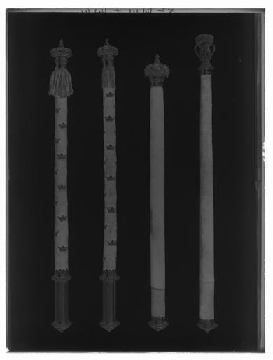 | Keywords: Häroldsstav - Livrustkammaren - 226-negative.tif Stav av trä svagt konisk klädd med grön sammet skarvad nertill med ca 90 mm brett stycke Beslag av förgylld mässing i nederänden doppsko med ca 13 mm bred ring med överkanten i runda tungor därnedanför en kraftig vulst d 50 6 mm utformad som en äggstav välvd krysantemumliknande centrumplatta med mittknapp <br/>I överänden en ca 14 mm bred ring med slät vulst nertill d 31 2 mm upptill en kraftig vulst sompå doppskon d 42 mm centrumplatta och därpå fäst en ca 75 mm hög vase i form av en sädeskärve ombunden med blankpolerade band öronen likaså blankpolerade original caption häroldsstav - LRK 6381 ca 1830 wood - brass - velvet Färg grön material sammet size mm 712 size mm 32 vid doppskon size mm 23 vid toppbeslag size mm 35 doppsko ca size mm 95 toppbeslag ca g 640 LRK Kungl Majestäts Orden KMO Axel August Roos Kammarherre Ordensutställningen 1948 Kungligt klädd 1987-1989 place of origin original filename LN_A02260_002260 42909 inventory number LRK 6381 226 CC0 Häroldsstav - Livrustkammaren - 226 tif |