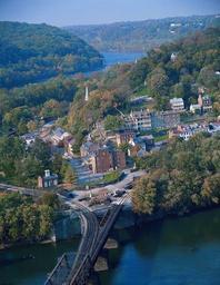 Keywords: harpers ferry west virginia town buildings architecture forest trees woods fall nature outside autumn river water bridge