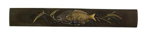 | Keywords: Haruaki - Kozuka with Fish and Shells on Bamboo - Walters 51839.jpg Two fish and three shells are laid out on shoot of bamboo The top fish is a sea bream which celebratory associations This may be a display of food for New Year's celebrations century 19 late Edo shibuichi gold silver copper cm 9 8 accession number 51 839 7313 William T / Henry Walters Collection Baltimore date and mode of acquisition unknown Walters Art Museum Henry Walters Acquired by William T or Henry Walters Signature Haruaki kao ; Sticker Pink line along one edge; Transcription Mari place of origin Edo present-day Tokyo Japan Walters Art Museum license Kozuka in the Walters Art Museum Media contributed by the Walters Art Museum needs category review Haruaki |