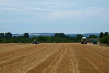 Keywords: harvest agriculture field cereals field crops arable mow harvester tractor summer harvested tractors nature stubble wide harvest time fields trailers landscape