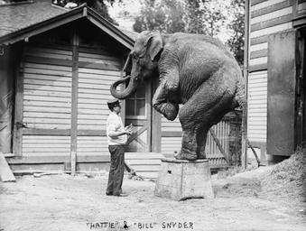 | Keywords: „Hattie“ the elephant and Bill Snyder (02).jpg Hattie the elephant and Bill Snyder <br/><br/> Bain News Service publisher <br/>1 negative glass ; 5 x 7 in or smaller <br/>Notes Title from unverified data provided by the Bain News Service on the negatives or caption cards <br/>Forms part of George Grantham Bain Collection Library of Congress <br/>Format Glass negatives <br/>Rights Info No known restrictions on publication <br/>Repository Library of Congress Prints and Photographs Division Washington D C 20540 USA hdl loc gov/loc pnp/pp print<br/> General information about the Bain Collection is available at hdl loc gov/loc pnp/pp ggbain<br/>Persistent URL hdl loc gov/loc pnp/ggbain 13521<br/>Call Number LC-B2- 2753-15 ggbain 13521 between 1910 1915 author publisher Bain News Service PD-Bain Hattie elephant |