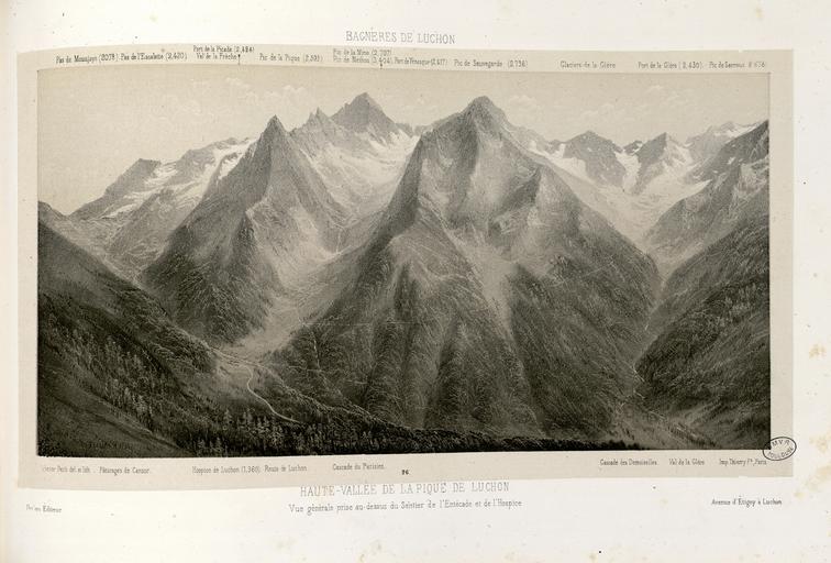 Keywords: Haute-Vallée de la Pique de Luchon - Vue générale prise au-dessus du Sentier de l'Entécade et de l'Hospice - Fonds Ancely - B315556101 A PETIT 1 025.jpg Fait partie d'un recueil de 30 lithographies chiffrées de 1 à 30 La lithographie n°16 est sur double page il n'y a pas de lithographie chiffrée 17 Les planches du premier tirage de cette suite imprimées chez Thierry à Paris ont été publiées en 1854 et 1855 L'éditeur de Victor Petit n'est plus celui des précédents recueils Bassy à Pau mais Dulon libraire-éditeur à Bagnères-de-Luchon et à Saintes Dulon publiera ultérieurement à plusieurs reprises des recueils de vues de Luchon et autres sites des Pyrénées par Victor Petit dont la composition est très variable Les planches ne seront plus tirées chez Thierry mais par l'imprimerie J Monrocq à Paris Pièce jointe entre la pl 6 et la pl 7 une pl extraite de Les Pyrénées a été ajoutée Sa légende est la suivante Cirque de Gavarnie - Vue prise du Chemin de la Coumélie Cette planche a été éditée par Dulon mais a été imprimée chez J Monrocq à Paris Ancely René 1876 - 1966 Possesseur fre public domain domaine public B315556101_A_PETIT_1_025 jpg image/jpeg 1 f de pl lithogr ; 26 5 cm oblong Dulon Éditeur Thierry 17 -18 ; imprimeur-lithographe Imprimeur http //numerique bibliotheque toulouse fr/collect/general/index/assoc//ark /74899/B315556101_A_PETIT_1_025 dir/B315556101_A_PETIT_1_025 jpg Bibliothèque municipale de Toulouse A-PETIT 1-24 Creator Victor Jean-Baptiste Petit http //catalogues toulouse fr/web2/tramp2 exe/do_keyword_search/log_in setting_key BMT1 servers 1home query p001937 vignette http //numerique bibliotheque toulouse fr/collect/general/index/assoc//ark /74899/B315556101_A_PETIT_1_025 dir/B315556101_A_PETIT_1_025_thumb jpeg century 19 Haute-Vallée de la Pique de Luchon - Vue générale prise au-dessus du Sentier de l'Entécade et de l'Hospice B315556101_A_PETIT_1_025 lithography - print Waterfalls in art Victor Jean-Baptiste Petit History of Pyrénées Bagnères-de-Luchon in art Roads in art Mountains in art Valleys in art