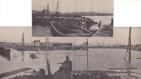 | Keywords: HavenwerkenAntwerpen.png nl De doorbraak in de havenwerken te Antwerpen - Voor het in aanbouw zijnde droogdok ter lengte van 210 M en ter breedte van 25 M werd voor den bestaanden kaaimuur in het Lefebvredok een breede dam aangelegd bestaande uit 2 rijen palen met een aardeopvulling daartusschen; op deze wijze meende men den waterdruk te weren en het droge dok droog te kunnen werken door middel van electrische pompen In December echter bezweek reeds een gedeelte van den dam en daarna hadden meerdere verzakkingen plaats met het gevolg dat er kortelings een groote bres onstond in den dam en ook de nieuwe kaaimuur doorbrak; de 40 cM dikke balken werden als stekjes gebroken en binnen eenige minuten stond het water een paar Meter hoog in het nieuwe dok - Voor de herstelling zijn talrijke werkkrachten in dienst gesteld - Foto boven Gezicht op de doorgebroken verbinding tusschen het Lefebvredok en het nieuwe droge dok - Foto links De nieuwe kaaimuur over een lengte van pl m 15M doorgebroken en ingestortl hierop stondde kraan van 8 ton die in de diepte verdween - Foto rechts gezicht op het nieuwe droge dok dat tengevolge van de doorbraak onderliep; op den achtergrond de doorgebroken muur De prins der geillustreerde bladen V Leers 1911-03-04 PD-old De Prins der Geillustreerde Bladen Port of Antwerp Construction sites in Belgium |