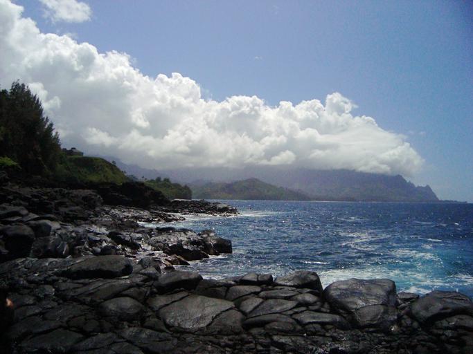 Keywords: hawaii ocean clouds blue sky shore volcanic rock nature sea water shoreline scenic vista outside pacific beach black rocks