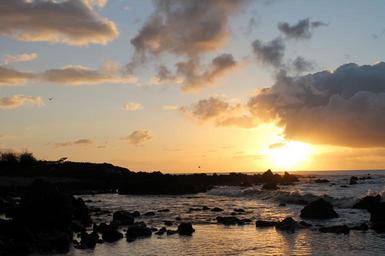 Keywords: hawaii sunrise sandy beach morning dawn sea horizon rocks waves clouds oahu