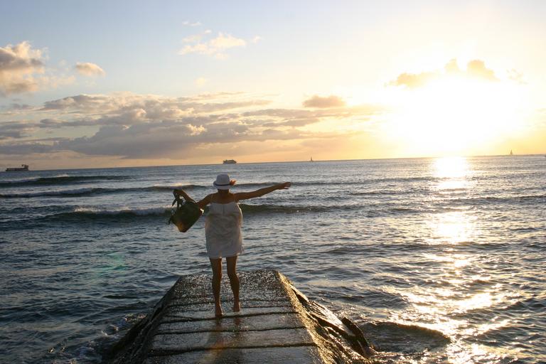 Keywords: hawaii waikiki honolulu beach evening woman holiday white hat wave sea ocean america usa sun sunset summer warm bag jump away wet sport horizon