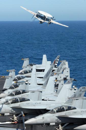 | Keywords: Hawkeye launches off USS Ronald Reagan DVIDS159960.jpg en An E-2C Hawkeye assigned to the Black Eagles of Airborne Early Warning Squadron 113 departs from the flight deck of the Nimitz-class aircraft carrier USS Ronald Reagan Missions for the Hawkeye include offensive and defensive counter air control air interdiction and surface surveillance coordination Ronald Reagan and Carrier Air Wing 14 are underway conducting a sustainment exercise in the Pacific Ocean 2009-03-24 Rosalie Garcia https //www dvidshub net/image/159960 090324-N-+++++-090 2009-03-26 05 02 USPACOM AT SEA PD-USGov-Military-Navy Northrop Grumman E-2C Hawkeye aircraft carrier take-offs Military aircraft in flight near USS Ronald Reagan CVN-76 Images from DoD uploaded by Fæ |