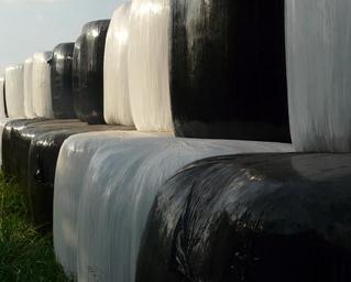 Keywords: hay bales black and white bale hay round bales slide packed plastic hay balls winter feed
