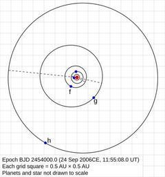 | Keywords: HD10180OuterOrbits.svg en Plot of the orbits of the outer planets in the HD 10180 system Orbit data taken from Lovis et al 2010 The HARPS search for southern extra-solar planets XXVII Up to seven planets orbiting HD 10180 probing the architecture of low-mass planetary systems available at http //www eso org/public/archives/releases/sciencepapers/eso1035/eso1035 pdf This image only includes the orbits of the outermost five planets d e f g h and of these only f g and h are labelled The innermost orbit corresponds to planet d the next one out is that of planet e The configuration is given in Table 6 and the orbits are taken to be coplanar with the planets revolving anticlockwise about the central star Orbits are depicted as being astrocentric as the true masses are unknown making the computation of the position of the barycentres impossible own Icalanise 2010-08-25 <gallery> File HD10180Orbits svg Combined with the inner orbits </gallery> HD 10180 Exoplanet diagrams Hydrus |
