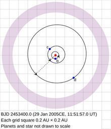 | Keywords: HD69830orbits.svg en Plot of the orbits of the HD 69830 system Orbit data taken from Wright et al 2009 The Astrophysical Journal 693 2 1084 “1099 http //adsabs harvard edu/abs/2009ApJ 693 1084W Ten New and Updated Multiplanet Systems and a Survey of Exoplanetary Systems The configuration is given in Table 1 and the orbits are taken to be coplanar Planetary positions are given for the epoch BJD 2453400 0 which lies within the quoted times of periastron passage for the three planets The orbits are taken to be astrocentric rather than barycentric This is because the true masses of the planets are unknown so it is not possible to compute the actual positions of the barycentres Debris disc parameters taken from Lisse et al 2008 The Astrophysical Journal 658 1 584 “592 http //adsabs harvard edu/abs/2007ApJ 658 584L On the Nature of the Dust in the Debris Disk around HD 69830 In section 4 1 of the paper the dust disc is stated to be located at a distance of 0 93 “1 16 AU from the star which are used as the inner and outer boundaries of the annulus representing the disc Further details about how the orbital parameters are converted to SVG are available in the source code for the file own Icalanise HD 69830 Exoplanet diagrams Debris disks |