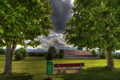 Keywords: hdr hdr image landscape bank clouds tree outlook bench seat idyll nature rest green distant view view mood