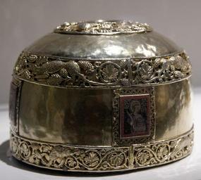 | Keywords: Head reliquary Dubrovnik Cathedral.jpg Head reliquary in the shape of a skull-cap with relics of St Blaise St Achilleus St Stephen and St Nereus Chef reliquaire en forme de calotte avec les reliques de saints Laurent Achillée Étienne et Nérée century 14 enamels silver gilt wood cm 14 19 5 Cathedral of Dubrovnik Treasure Domijan Miljenko Nikola JakÅ¡ić Michel Huynh and Elisabeth Taburet-Delahaye Et ils s'émerveillèrent L'art médiéval en Croatie Musée de Cluny musée national du Moyen Age 10 octobre 2012 - 7 janvier 2013 2013 no 31 exhibition history « Et ils s'émerveillèrent ¦ » L'art médiéval en Croatie Musée de Cluny “Musée national du Moyen Âge 10 Octobre 2012 “7 January 2013 object history credit line accession number own photo date 2013-01-05 User Jastrow/cc-by-2 5 artwork license PD-old-100-1923 photo license Cc-by-2 5 Reliquaries in Croatia Treasury of the Cathedral of Dubrovnik Taken with Nikon D800E Taken with Sigma 17-50mm F2 8 EX DC OS HSM Saints Nereus and Achilleus |